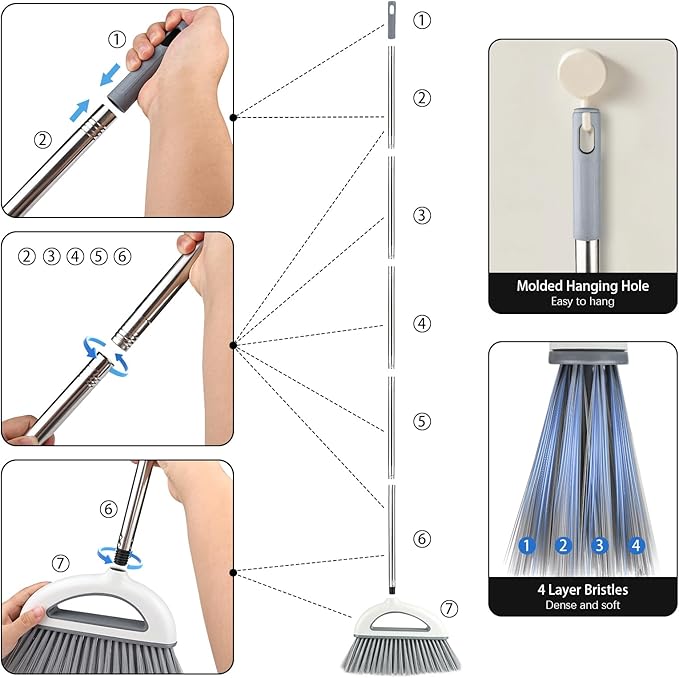 - Convenient Assembly:The 59 inch house broom comprises five stainless steel rods, each 11 inches long. Three rods can be combined into one or five rods can be combined into one to meet different height requirements. It allows you to maintain an upright position while cleaning and effectively reduces the number of bends and waste load.